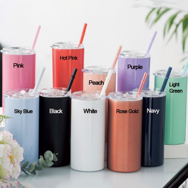 Double wall 18/8 stainless steel stemless skinny tumbler.